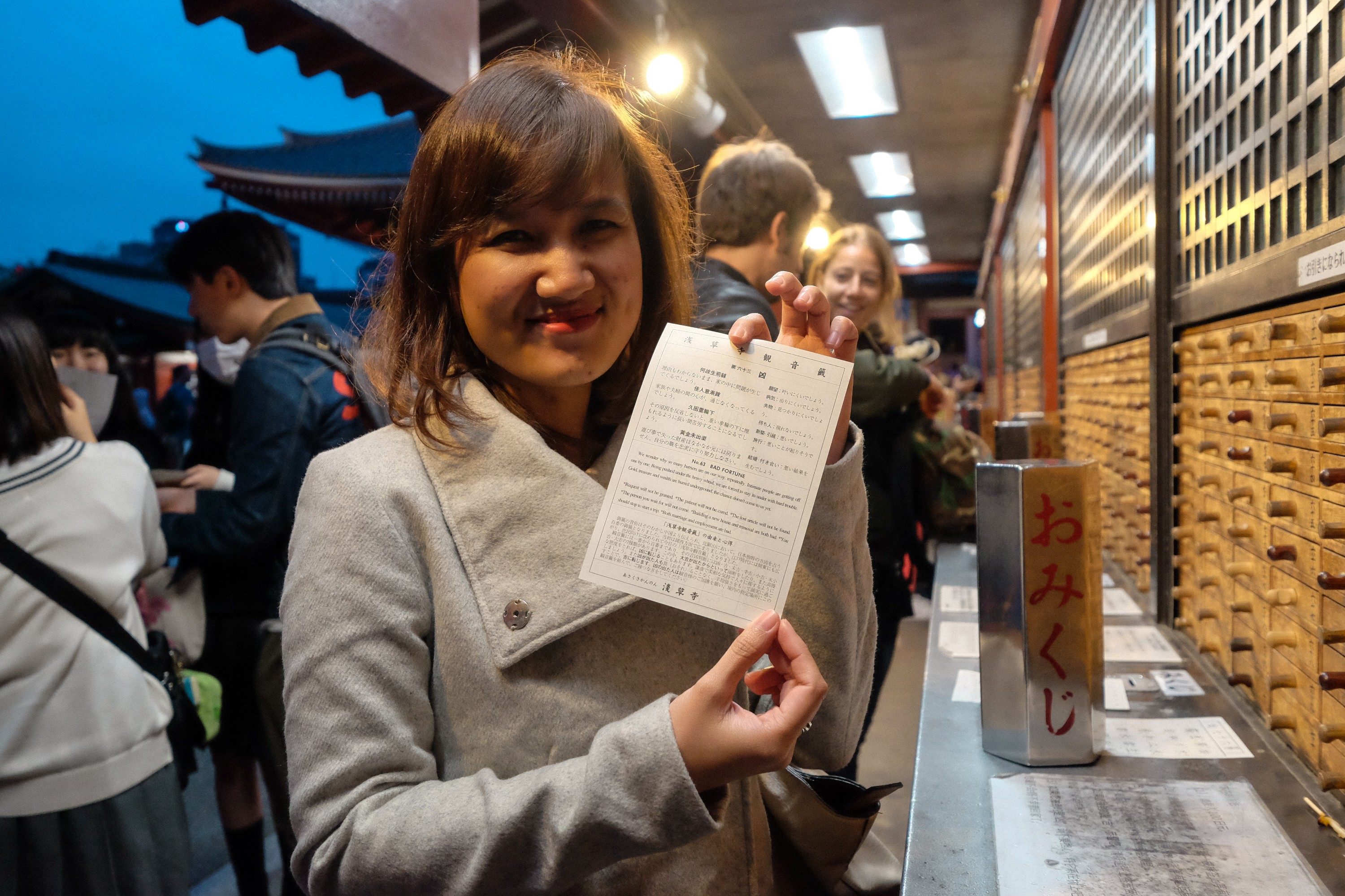 In order to get the O-mikuji, you must put in 100yen coin as donation inside the hole on the table. Then you can take the metal containers and shake it until one of the sticks pop out. The stick will reveal some letters, the letters represent the drawer you need to open.