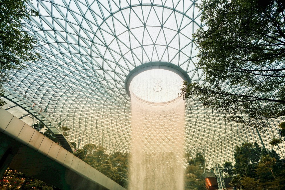 Having at least 40 height, the Rain Vortex is the largest and tallest indoor in the world. By seeing it from the plaza below, you can see the huge structure that circulates water from below then bring it to the roof to free fall from the round hole.