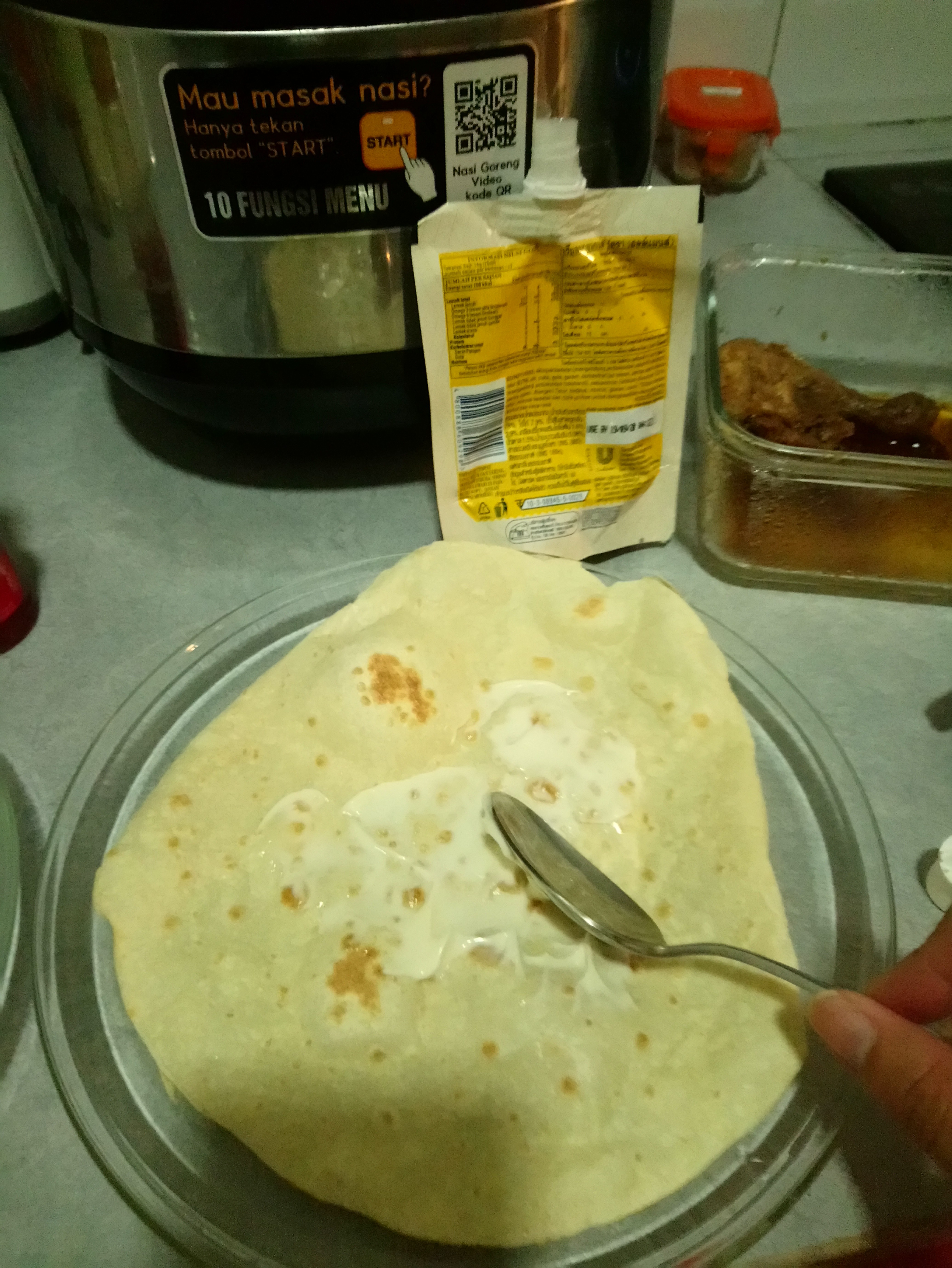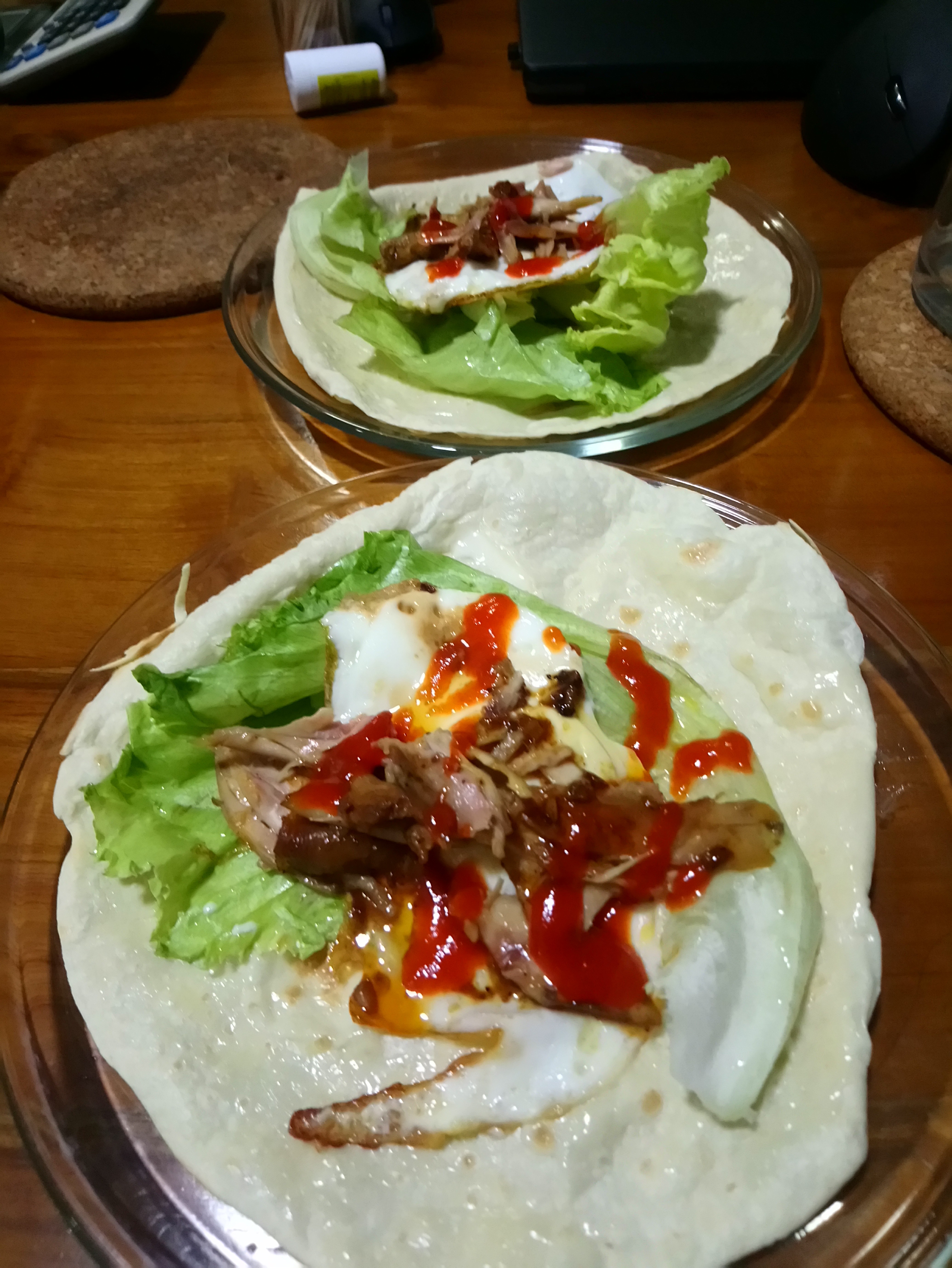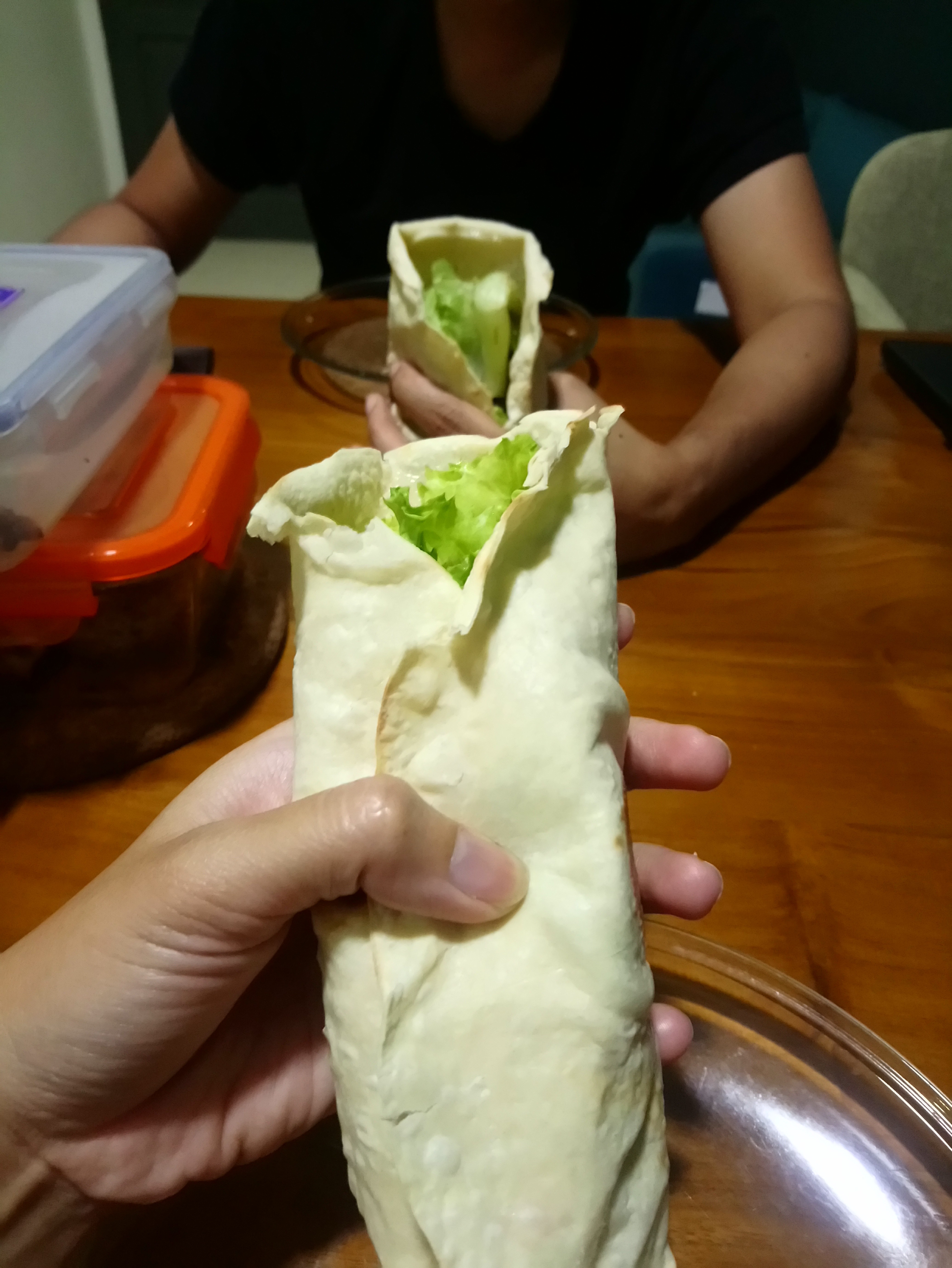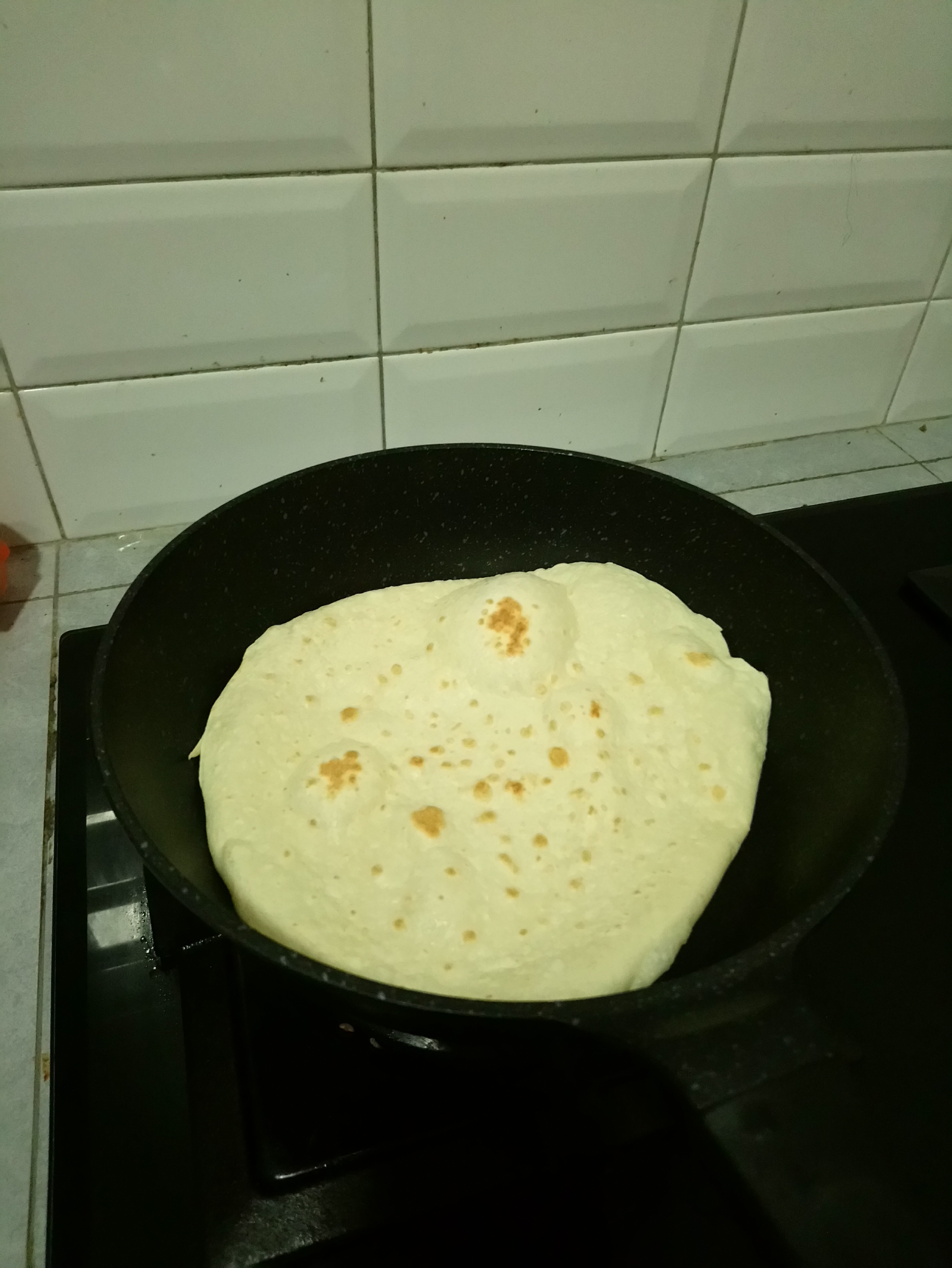 I usually bought the tortilla skin, but you can make it on your own. So all you need to do is to heat the tortilla onto hot pan (without oil) until slightly brown (don’t overcook)