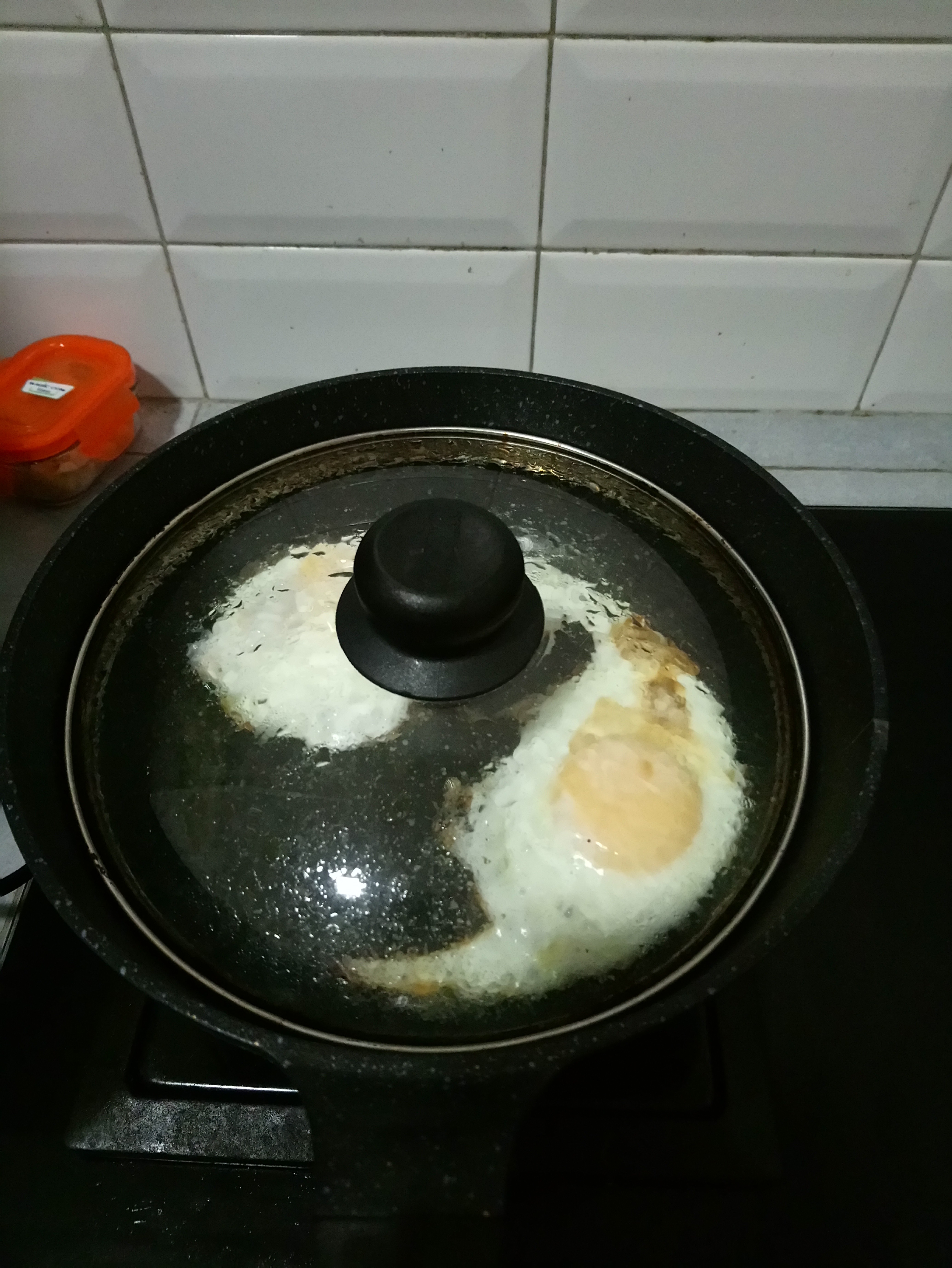 After that you can fry the egg (usually I make bull’s eye egg), put the egg on the hot pan (using oil) then add some light soy sauce then put the lid pan, wait until it cooked or half cooked.