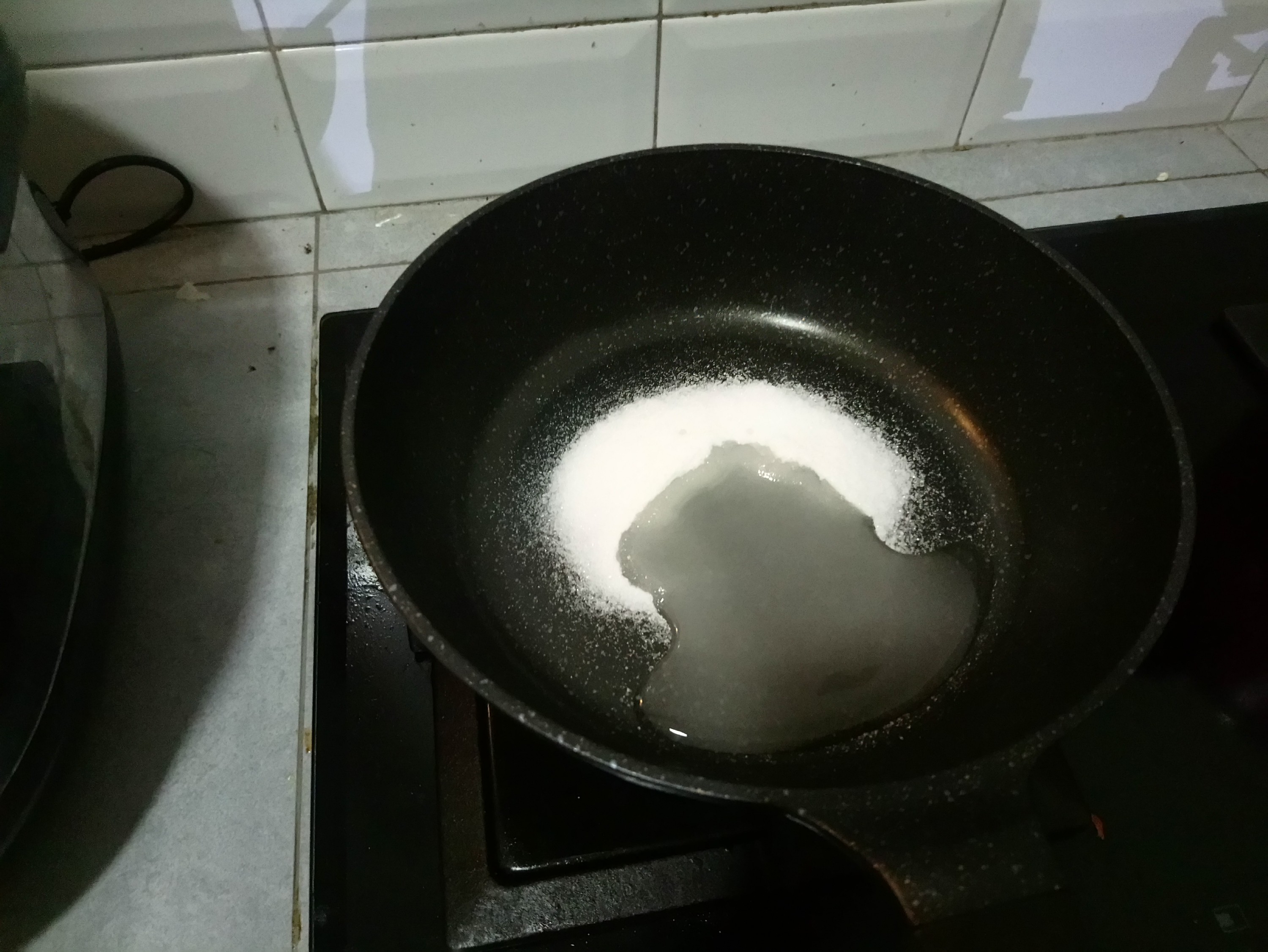 To make the caramel, prepare the pan, and set the fire into medium heat. Put the sugar and water into the pan.