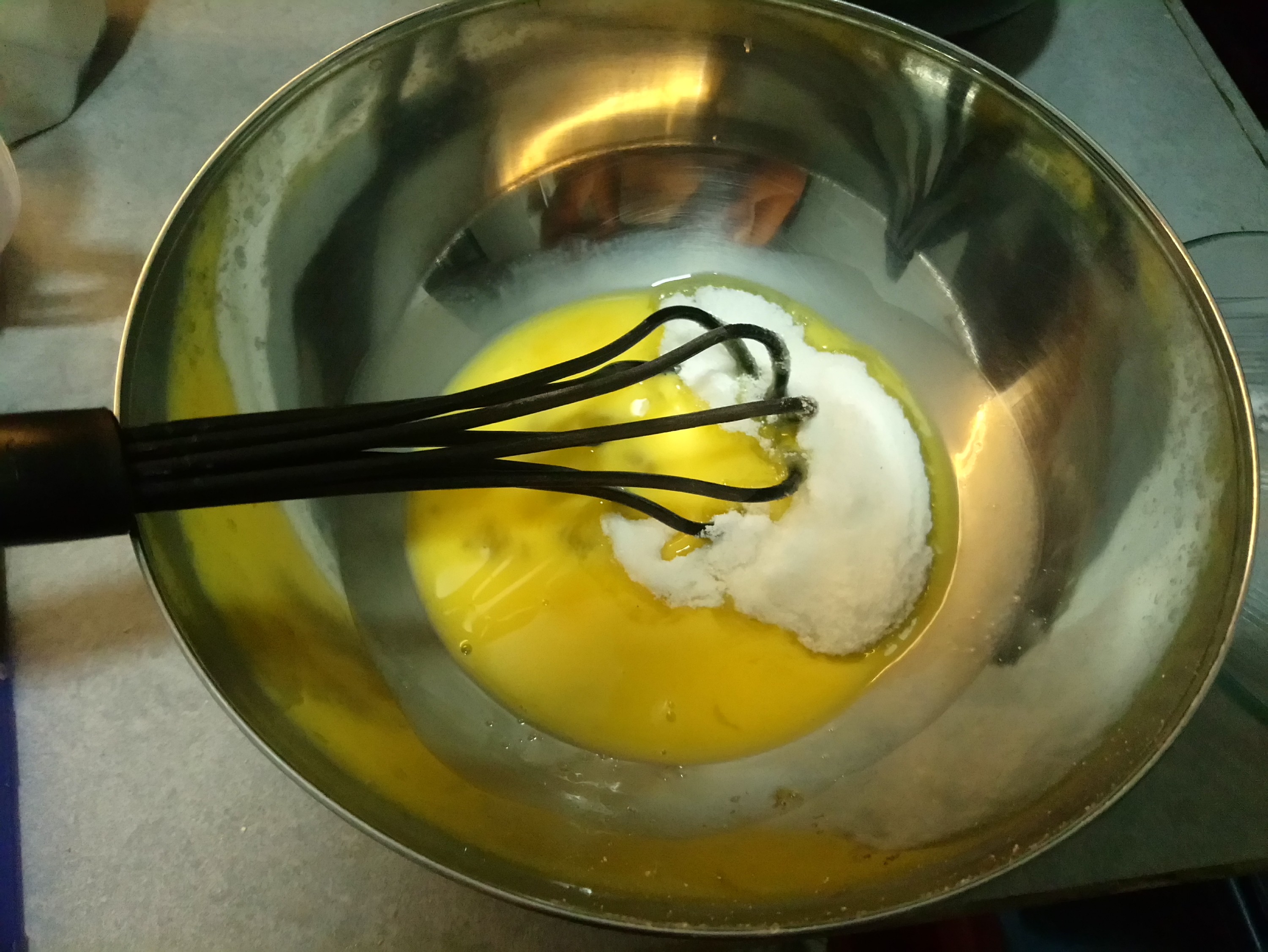 Put the eggs into a bowl then beat it (be careful not to make the egg bubbling) then put the sugar in