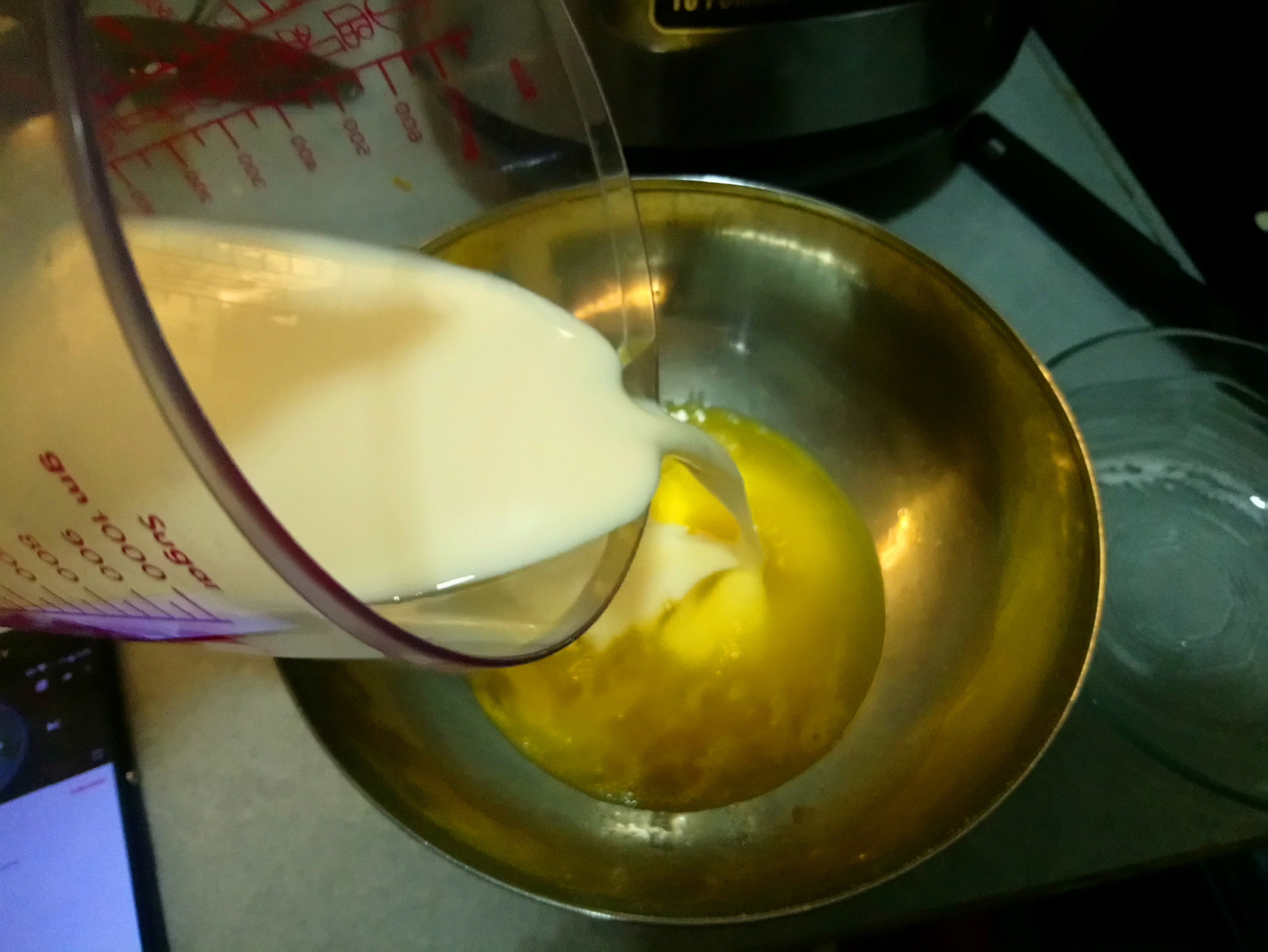 Mix well the sugar and eggs until the sugar dissolve. Then pour fresh milk into the mixture.