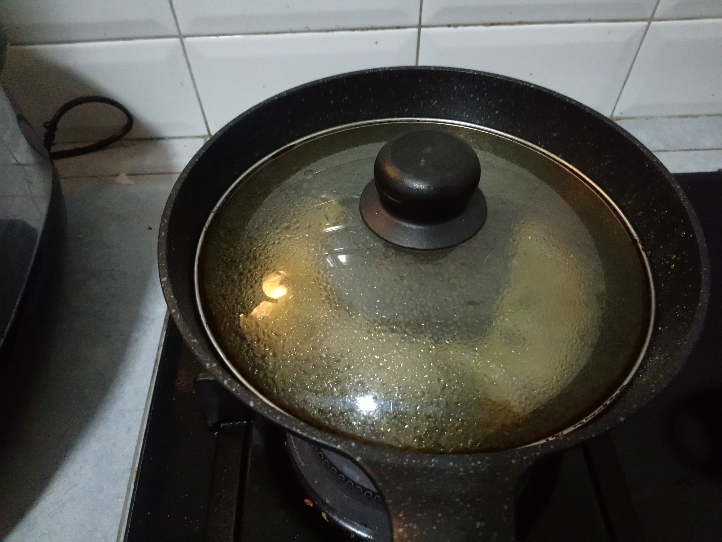 Then you can add 2 tbsp of hot water in it, be careful because the sound quite surprising then turn off the heat and put the lid on for a while