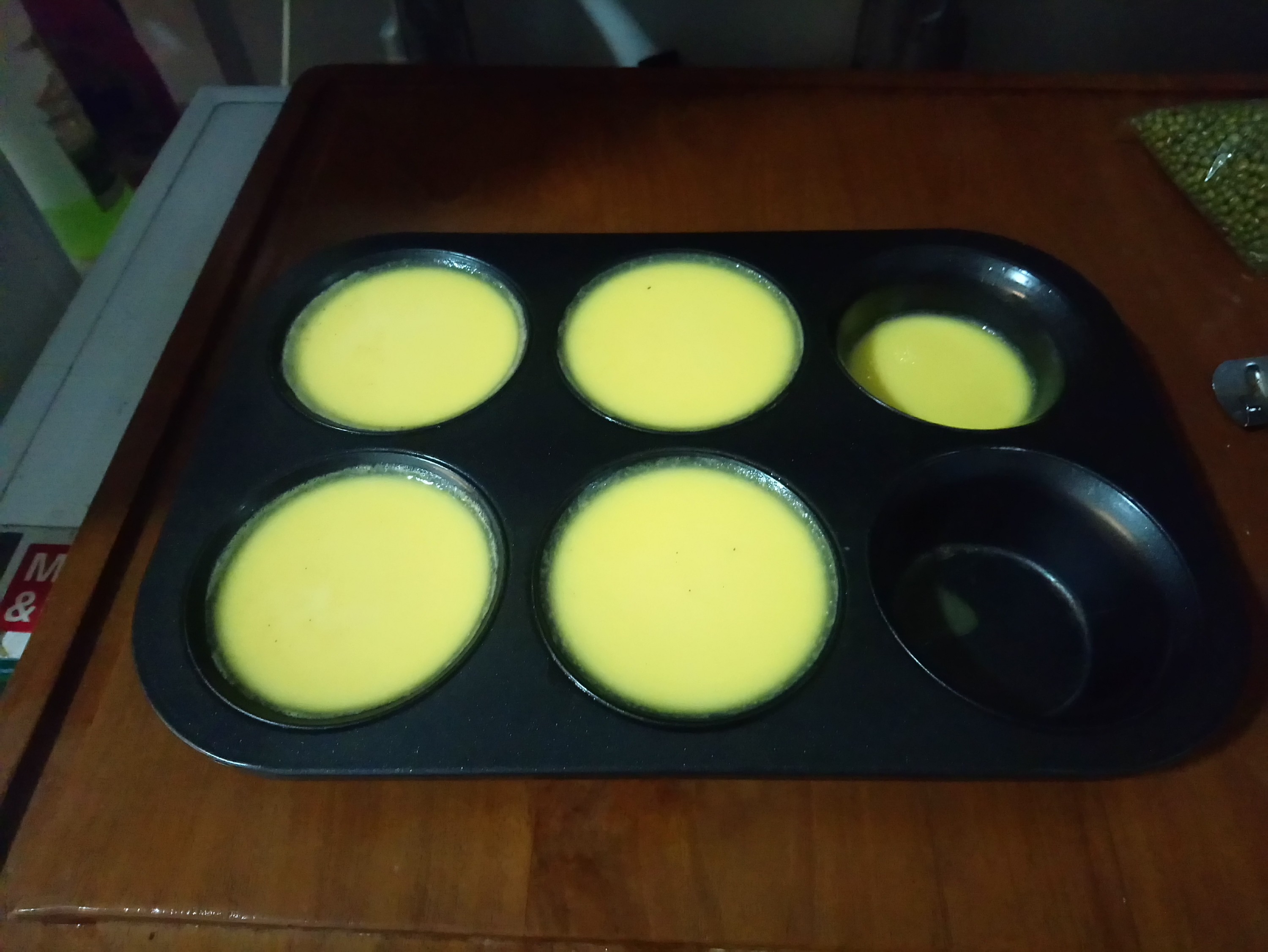 Pre heat the oven 180°C for 10 minutes, then put the custard mould in baking tray that has water in it. And put into the oven, bake it for 45 – 60 minutes.