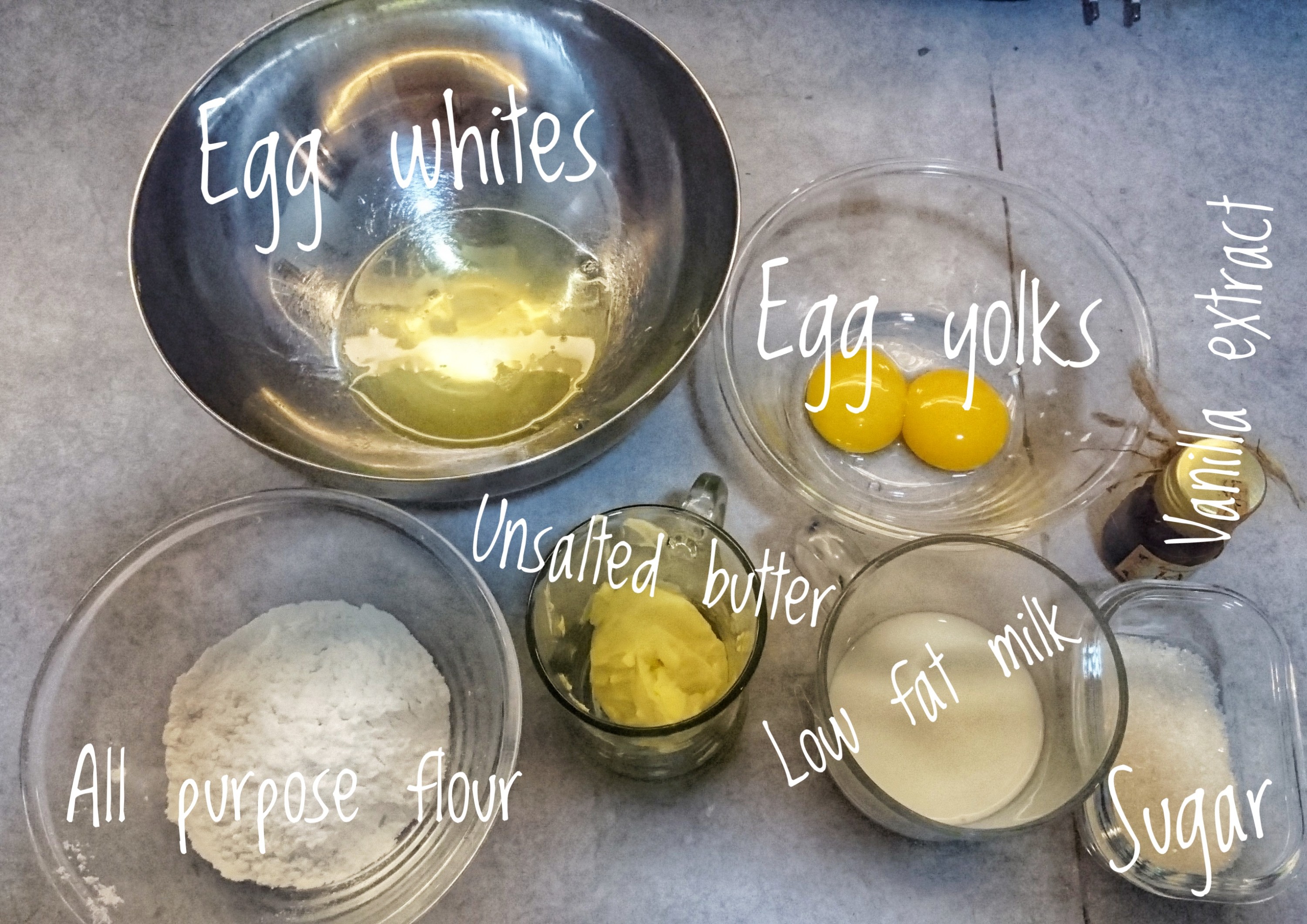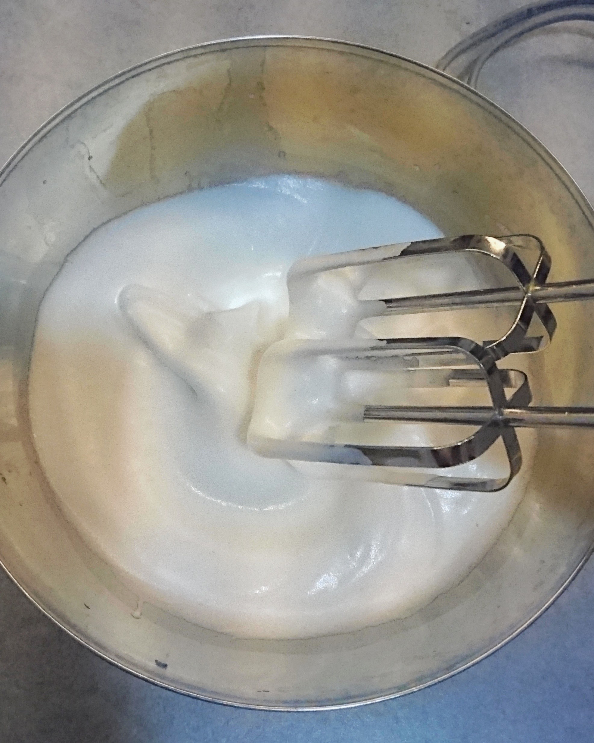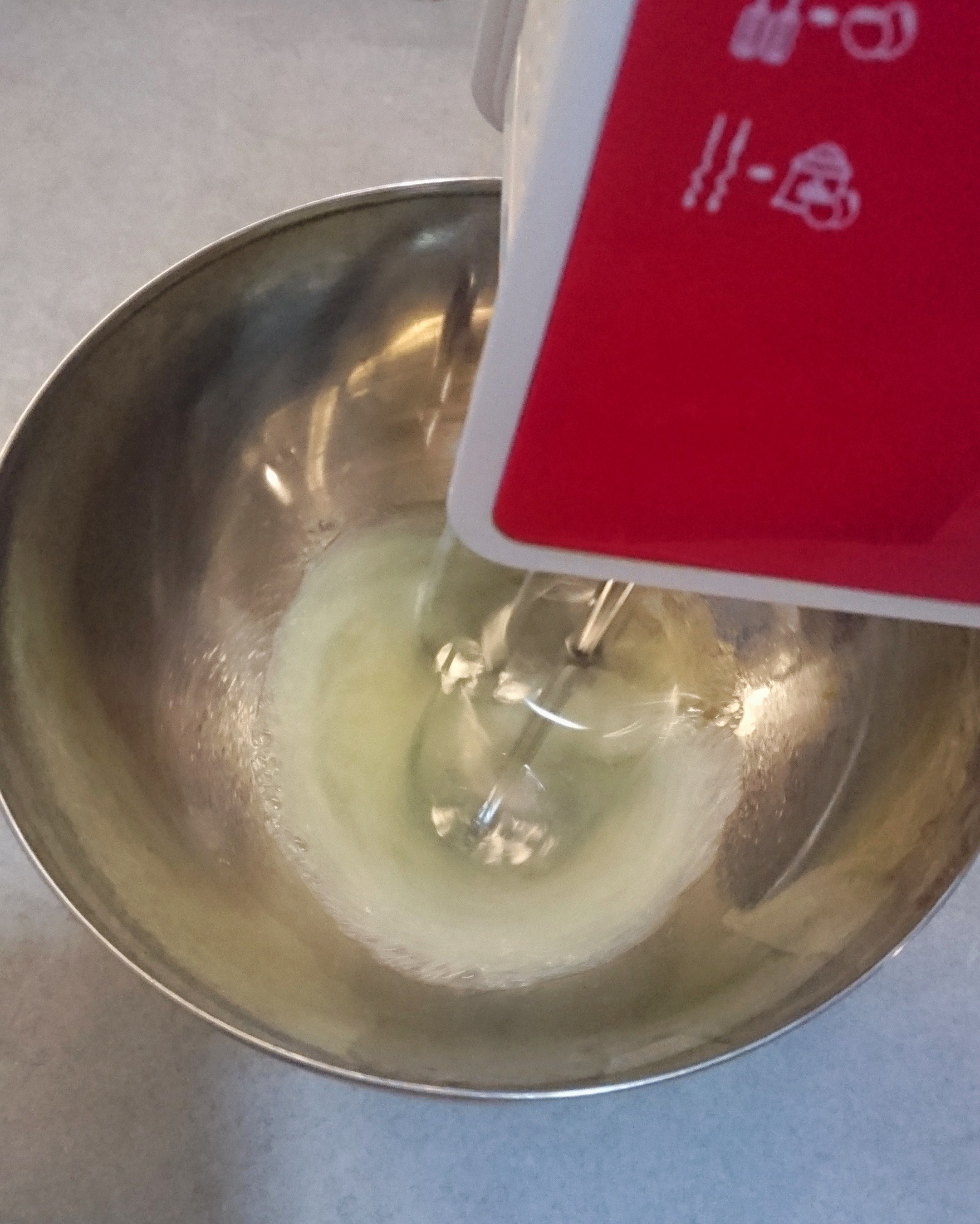 - In other bowl, whisk the egg whites using hand mixer or standing mixer, and gradually add the sugar, it takes about 3 minutes to get the meringue